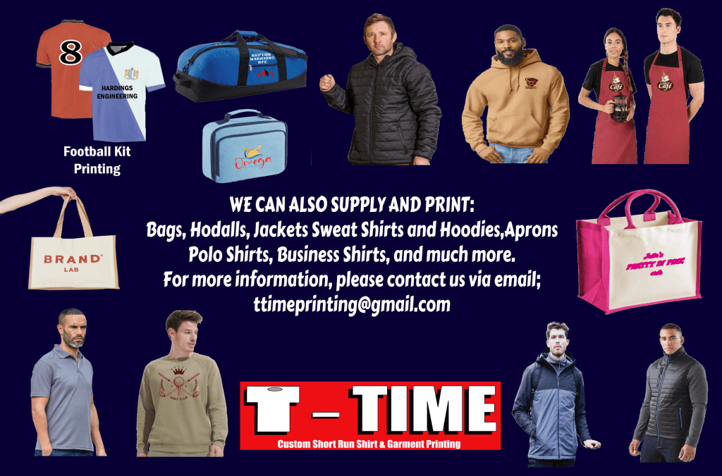 So, that’s what we offer. A short run or limited number of shirts and garments, with a minimum of one, and really, for technical and practical reasons, we wouldn’t go much about 25 -30 garments. So, whether you are a bunch of guys or girls heading out on a stag or hen night, a small business with just two or three employees or a sports team that need your sponsor’s name and perhaps numbers on your shirts, then T – TIME is the place for you! YES, we can do the job for you…it’s all about the details.
